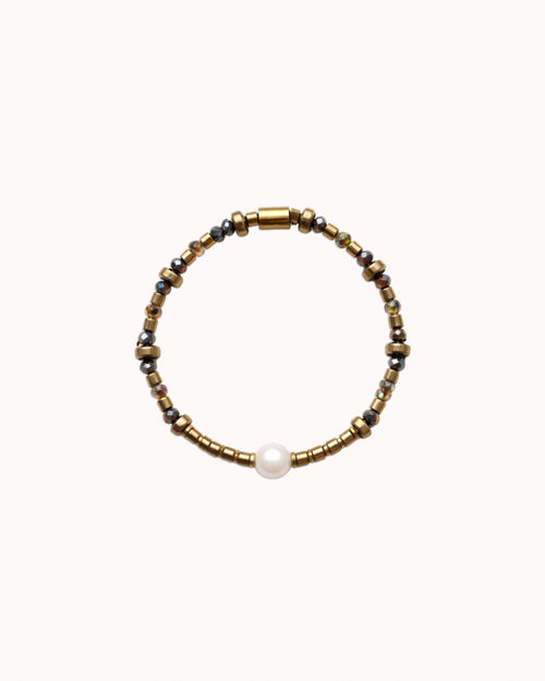 Des lignes pures, une présence qui s’impose. Les bracelets « Fil Doré » distillent l’essence du style Mima Bach dans sa forme la plus épurée : des cylindres en hématite dorée, des perles baroques choisies à la main, et des cristaux aux reflets fumés.